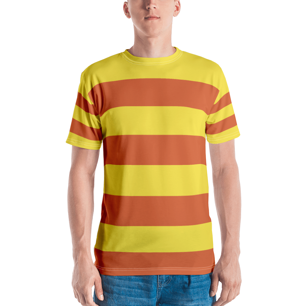 Whether saving the earth from alien invasion or enjoying some Magic Pudding, look your very best as you smash your way to victory. This design, inspired by in-game clothing, features alternating orange and yellow stripes.