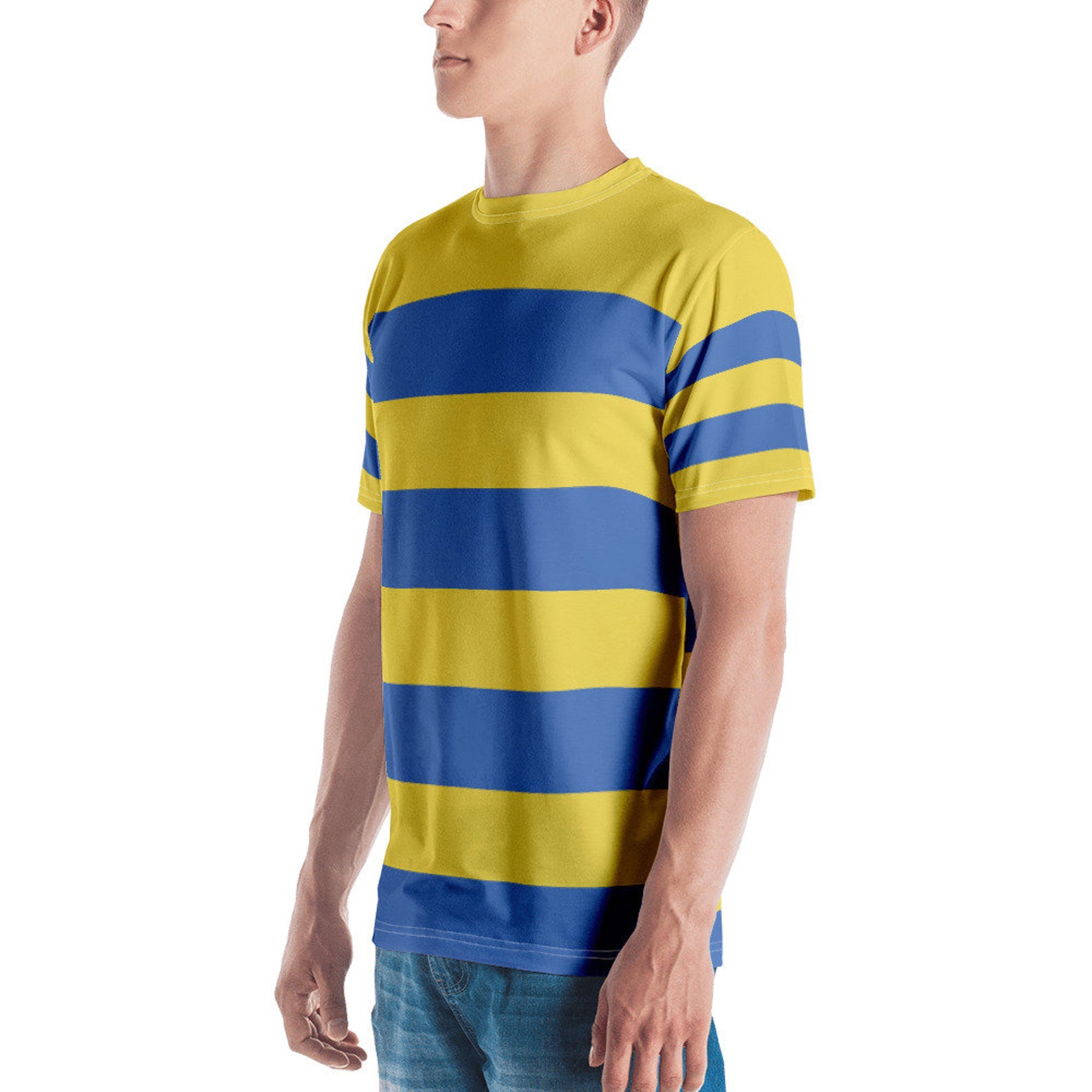 Whether saving the earth from alien invasion or enjoying some Mr. Saturn coffee, look your very best as you smash your way to victory. This design, inspired by in-game clothing, features alternating blue and yellow stripes.