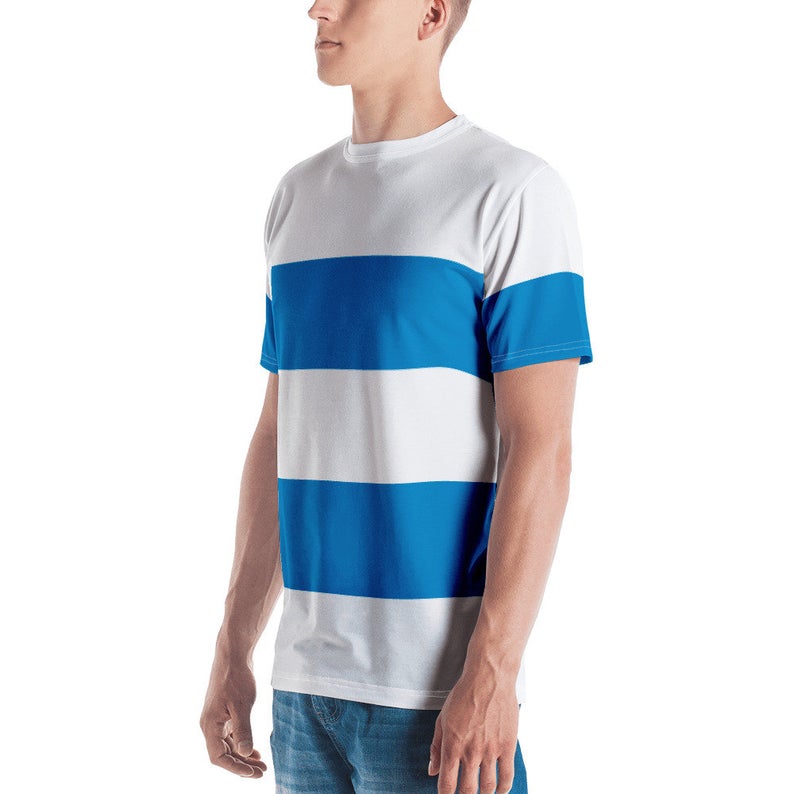 "Our plans to return everything to the beginning... they're as good as complete!" This design, inspired by in-game clothing, includes blue and white stripes.